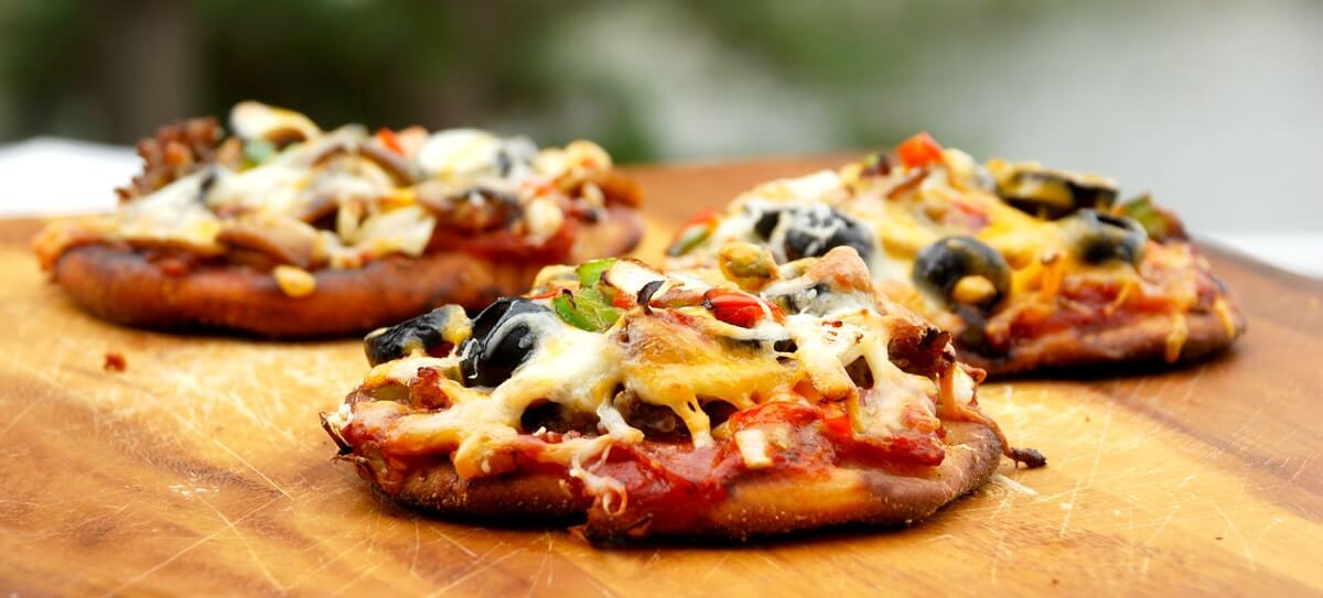 Pizza is an American favorite, so I’ll be making miniature, personal pizzas three ways – Italian, Hawaiian, and Greek, with apologies to those cultures. The dough and toppings for these pizzas can be prepped ahead so that assembly and grilling are all that’s necessary in the tailgate lot.